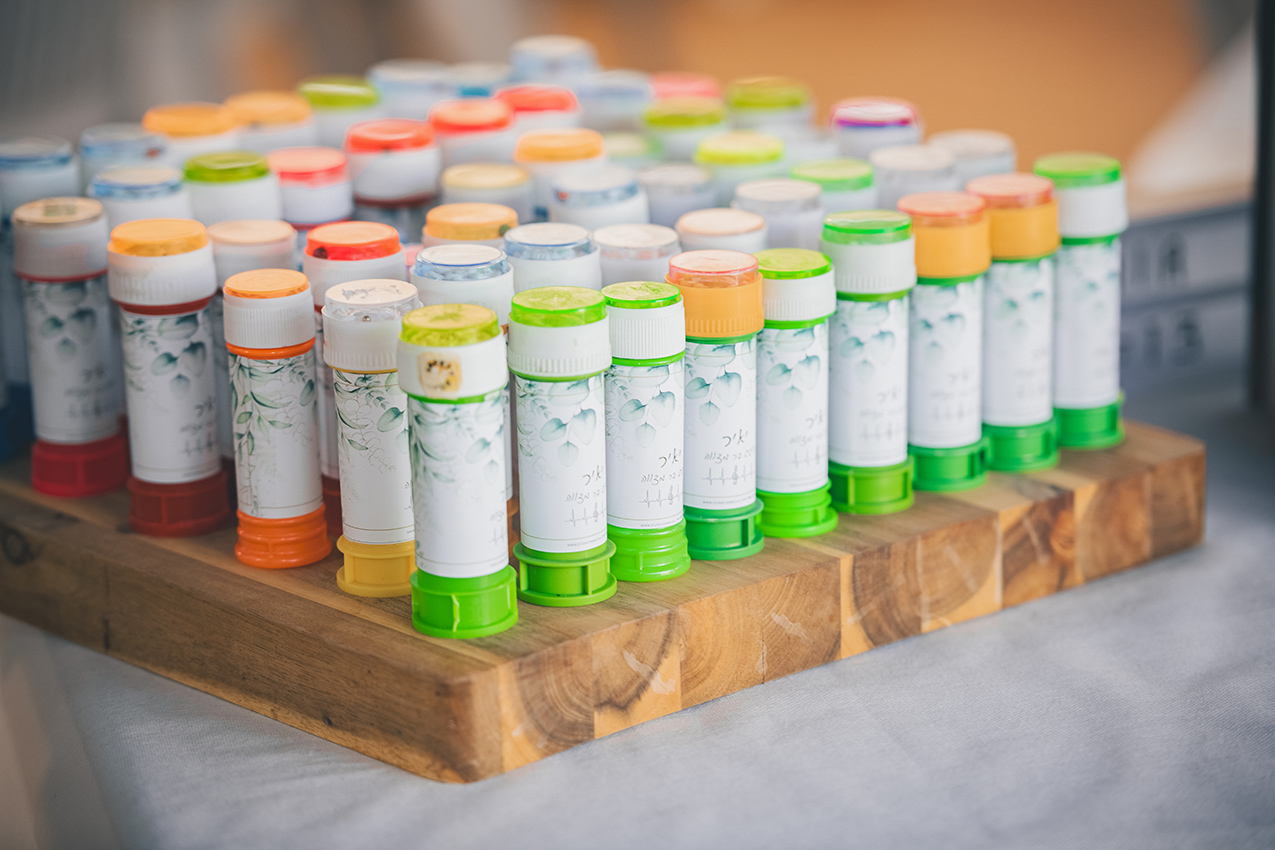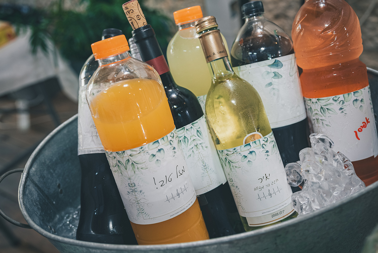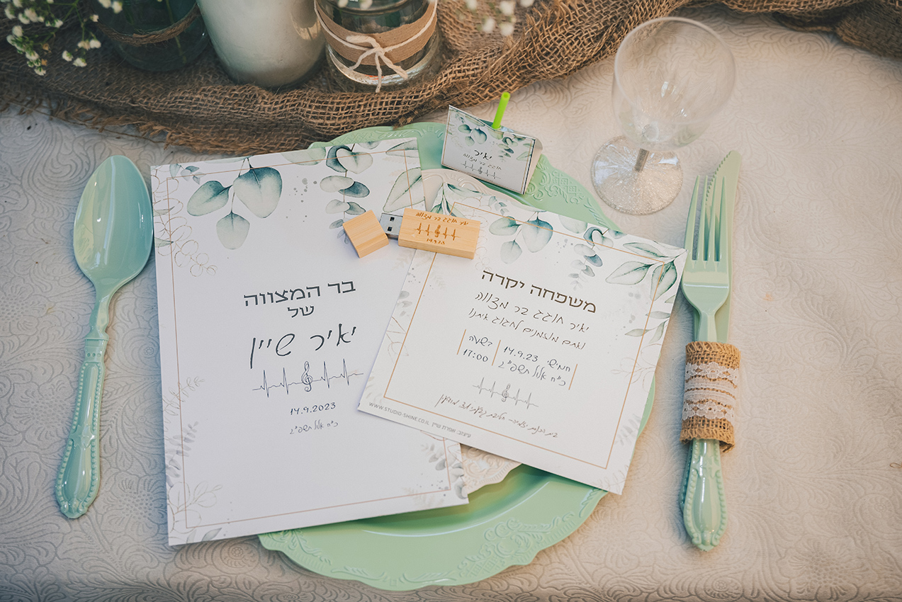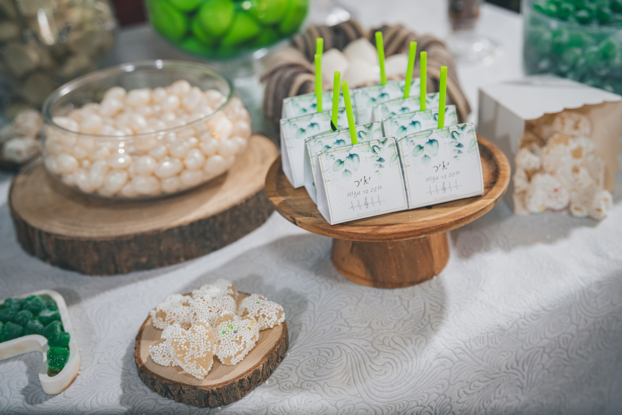 האירוע כולו היה כמובן ממותג בעיצובים שהכנתי, החל מההזמנה לאירוע, דרך העיצוב לשולחן המתוקים, בקבוקי שתיה וכו׳, מניפות, בועות סבון, חוברת שירים ופסוקים ואפילו דיסק און קי ממותג שהאורחים קיבלו במתנה בסוף האירוע.